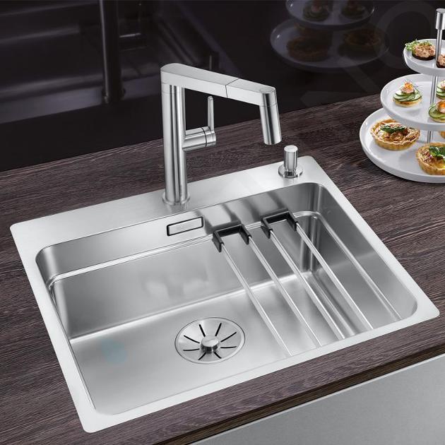Il lavello da cucina è realizzato in acciaio inox di alta qualità con un'elegante finitura lucida come la seta. È progettato per essere incorporato dall'alto o a filo del piano di lavoro. Blanco Etagon 500 è dotato di un "gradino" su cui è possibile posizionare facilmente le guide Etagon. Sui due binari scorrevoli è possibile appoggiare una pentola o una ciotola. Inoltre, è perfetto per riporre oggetti come spugna o un panno per i piatti.