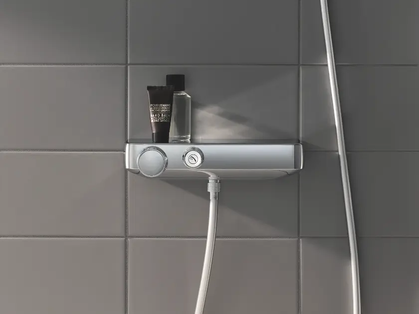 Il rubinetto della doccia é facile da usare. Si imposta la temperatura di mandata tramite la manopola rotante, mentre per la temperatura superiorea 38°C sará necessario rilasciare il fermo di sicurezza. Premendo il pulsante GROHE SmartControl avvierete e interromperete la doccia. Regolerete l'intensitá del flusso ruotandola. GROHE TurboStat, una cartuccia compatta con termocoppia, garantirá la stabilitá dei valori impostati. Un vantaggio del miscelatore termostatico é anche la protezione dalle scottature GROHE CoolTouch, che lascia sempre le superfici sufficientemente fresche. Il rubinetto termostatico sará apprezzato soprattutto dalle famiglie con bambini o anziani.