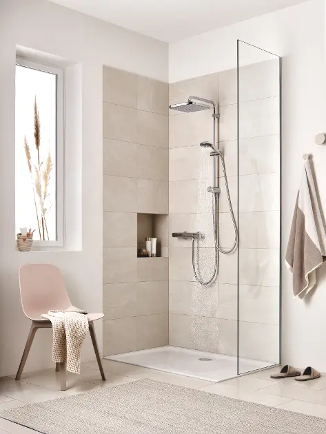 Oltre al flessibile Vitalio Flex da 1500 mm, il set Grohe Vitalio Start comprende anche un braccio doccia orizzontale orientabile da 390 mm.