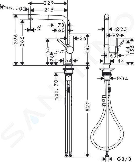 Il rubinetto da cucina Hansgrohe Talis eroga 8 litri d'acqua al minuto. È uno dei miscelatori per lavello più alti, con una zona di comfort di 270 mm. È girevole in 4 posizioni - 60°, 110°, 150° o 360°.